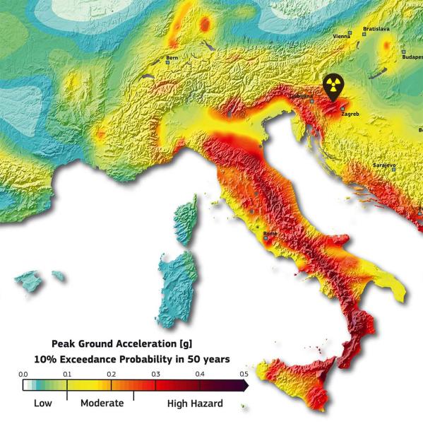 Abbildung: Ausschnitt der Karte Mapping Europe's Seismic Hazard von Giardini, D., J. Woessner, L. Danciu (2014)external link, opens in a new tab mit Einzeichnung der Lage des AKW Krško