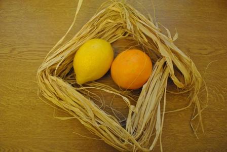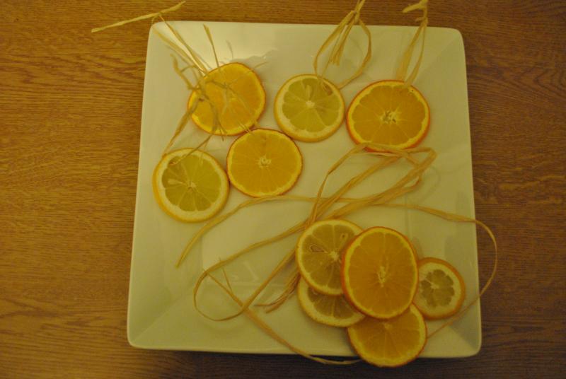 Scheiben einige Tage bei Raumtemperatur nachtrocknen lassen. Eine Schlaufe aus Bast macht die Orangen- und Zitronenscheiben zur festlichen Dekoration