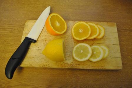 Orangen und Zitronen in etwa einen halben Zentimeter dicke Scheiben schneiden nicht zu dick, dann trocknen sie schneller.