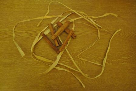 Je drei Zimtstangen einige Male mit Bast umwickeln, mit einer Masche verschließen, eine Schlinge aus Bast von unten zwischen zwei Zimtstangen zur Mitte ziehen und schon kann man die Deko auf den Weihnachtsbaum hängen.