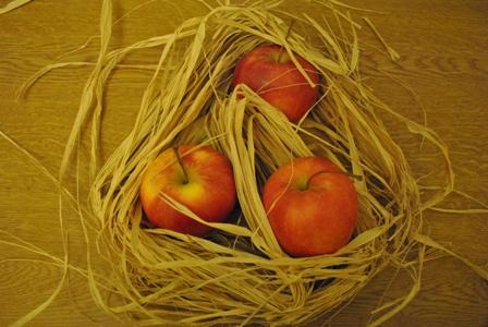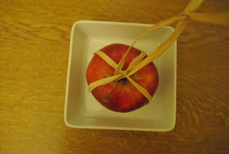 Äpfel kreuzweise mit Bast umwickeln. Wo die Schnüre sich beim Stengel kreuzen, einfach eine Schlaufe aus einem weiteren Stück Bast anknüpfen. Schon kann der Apfel auf einem etwas stärkeren Zweig aufgehängt werden.