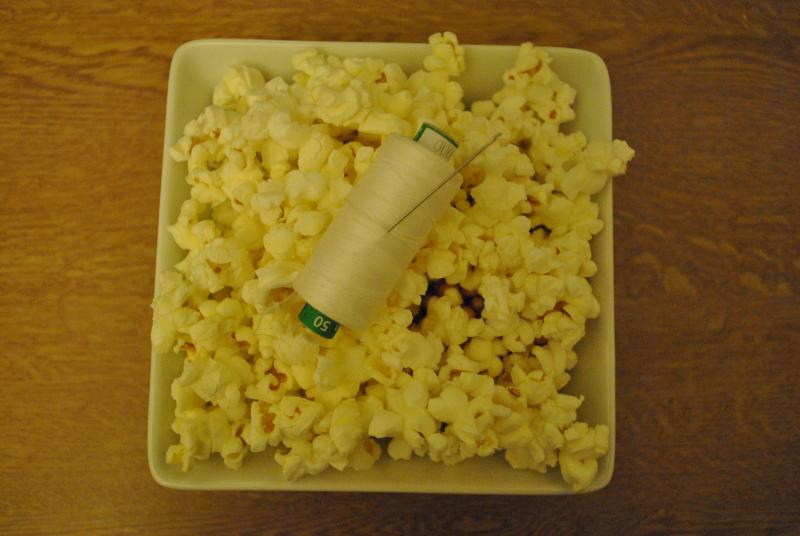 Popcorn mit Hilfe der Nadel auf den Faden fädeln, bis die Girlande die gewünschte Länge hat - hier ist Geduld und Fingerspitzengefühl gefordert. Diese Kette eignet sich wunderbar als Lametta-Ersatz.