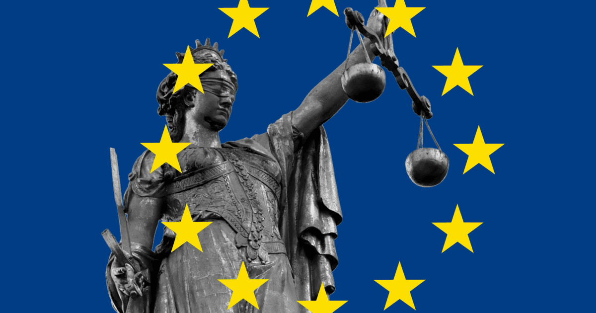 Collage: Justitia-Statue mit EU-Flagge