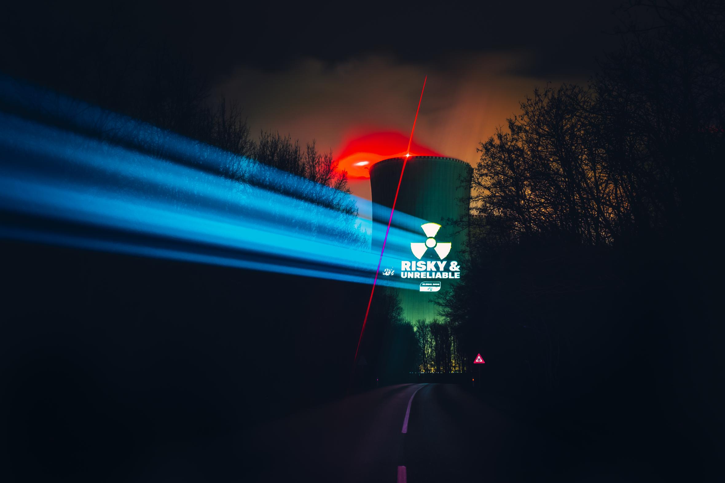 Nach einer langen Autofahrt ist das sechsköpfige Team vor dem alten AKW angekommen. Es ist stockfinster, kalt und es regnet. Der Aktion bringt das keinen Abbruch. Fleißig wird an der Installation gearbeitet, die den Reaktor kurze Zeit später zum Leuchten bringen soll. Die Beamer-Aktion macht auf den riskanten Zustand des Reaktors aufmerksam.