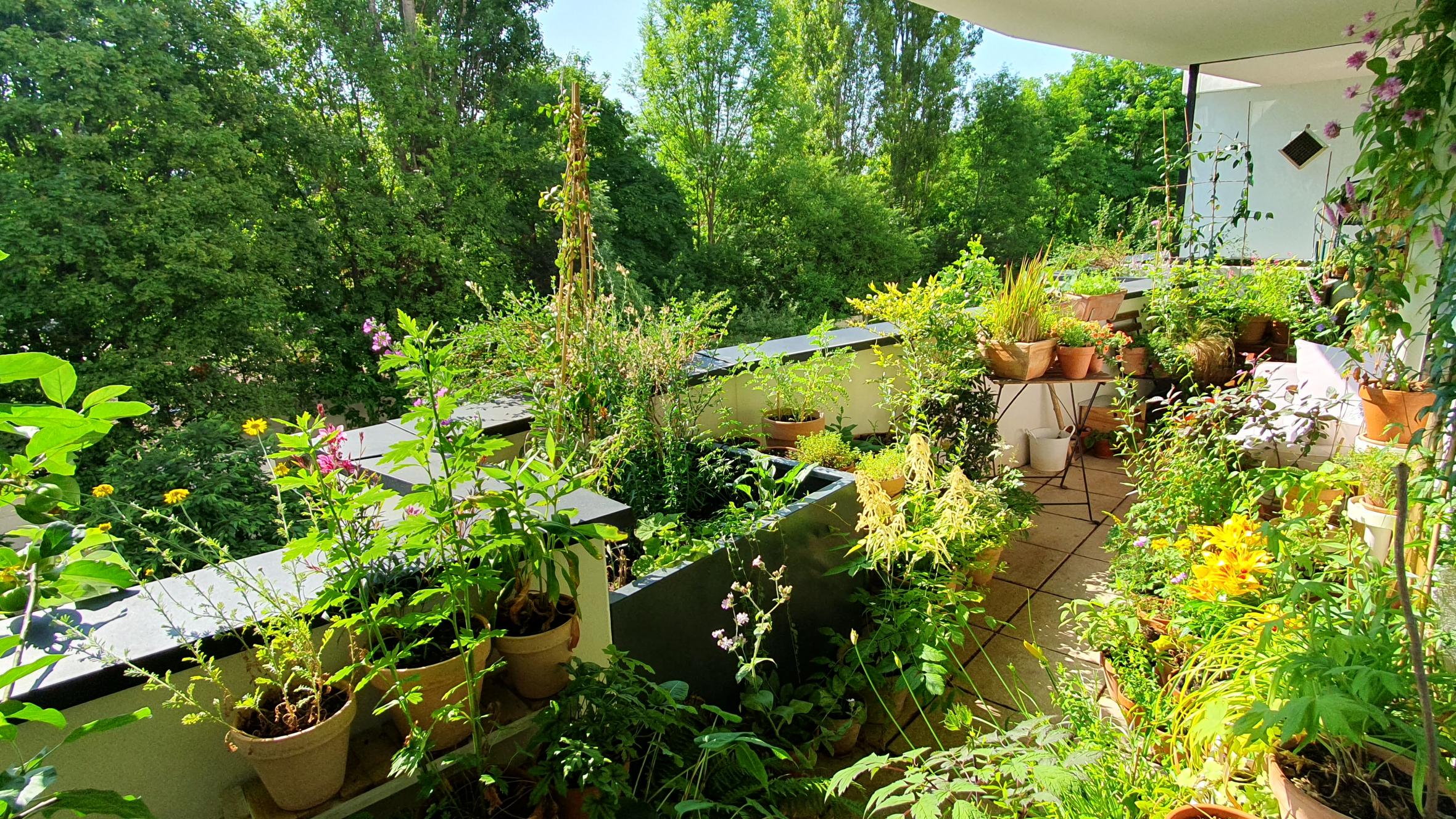 Balkon mit vielen Pflanzentöpfen