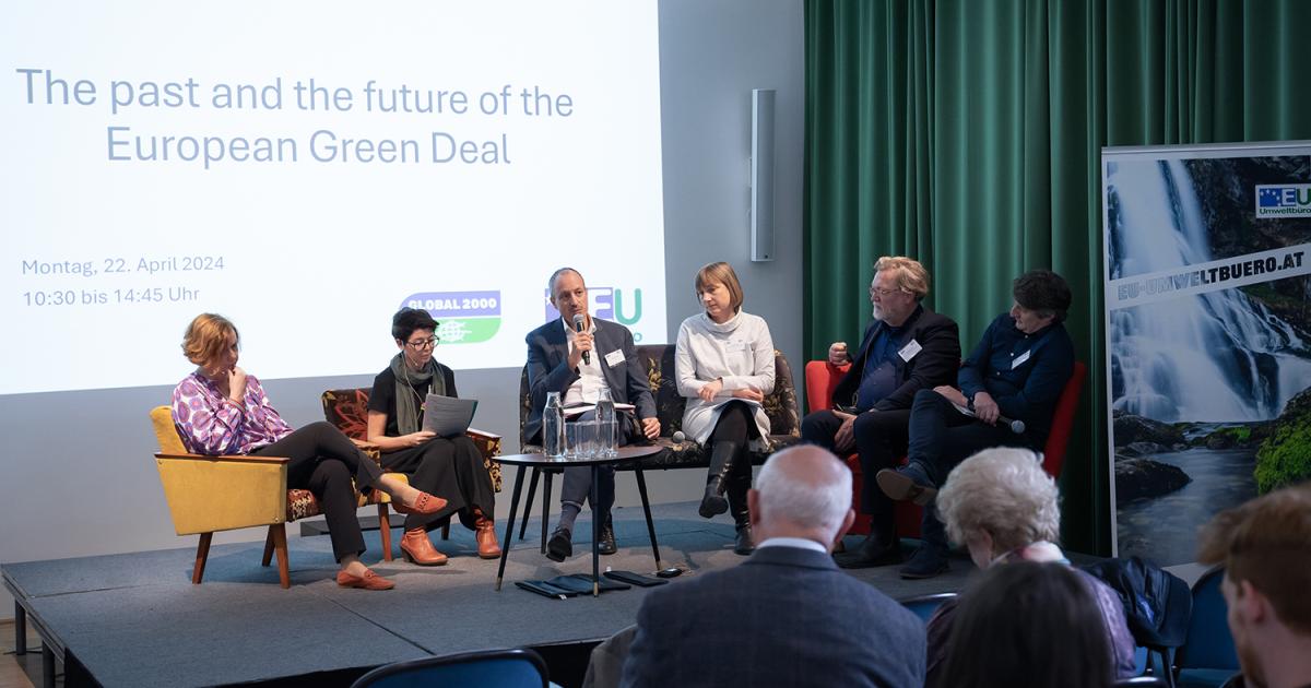 Nach einer Pause wurde dann die Diskussion mit politischen Vertreter:innen fortgesetzt. Lena Schilling (Grüne), Peter Berry (NEOS) und Andreas Preiml (SPÖ) diskutierten mit Bernhard Zlanabitnig (EU-Umweltbüro) und Johannes Wahlmüller (GLOBAL 2000). In der Diskussion wurden die nächsten Schritte diskutiert, die es auf europäischer Ebene braucht und auch die offenen Punkte der österreichischen Klimapolitik wurden diskutiert. Am Ende folgte ein Appell zur EU-Wahl zu gehen und sich davor eingehend zu informieren, denn die Beschlüsse auf EU-Ebene sind entscheidend für unser aller Zukunft.