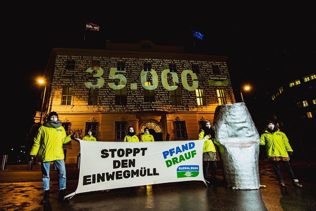 Knapp 35.000 ÖsterreicherInnen fordern mit uns ein umfassendes Einweg-Pfandsystem für Plastikflaschen, Glasflaschen und Dosen, sowie eine Erhöhung der Mehrwegquote – für eine saubere Natur! Wir haben die zahlreichen Unterschriften nun mit einer spektakulären Aktion an den Bundeskanzler übergeben.