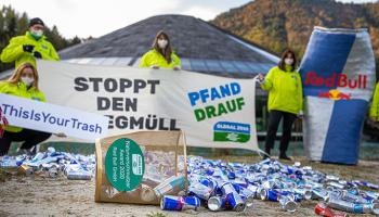 Ein Jahr lang wollte sich der Getränkehersteller nicht zu unserer Aktion und zum Thema Einweg-Pfandsystem äußern. Doch im Herbst 2021 hat Red Bull endlich reagiert! Nach unserer Aktion vor dem Red Bull Hauptgebäude hat sich das heimische Unternehmen nun doch überzeugen lassen: Red Bull unterstützt ab sofort ein Einweg-Pfandsystemexternal link, opens in a new tab! Der Energiedrink-Hersteller hat seine Blockadehaltung abgelegt und tritt nun endlich öffentlich für eine saubere Natur ein. Einmal mehr zeigt sich, dass Hartnäckigkeit und Aktionsbereitschaft Früchte trägt. Vielen Dank an alle die unsere "Pfand drauf"-Aktion unterstützt haben, gemeinsam haben wir den Megakonzern zum Umdenken gebracht.