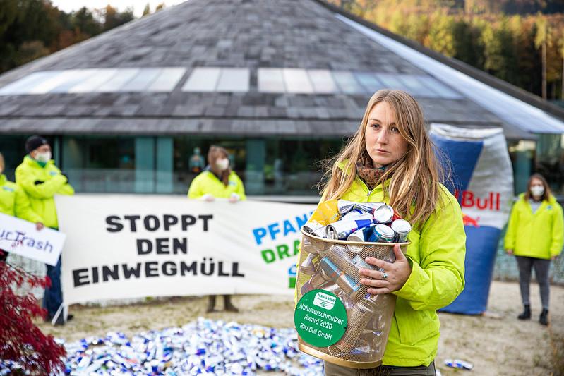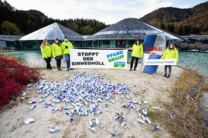 Gemeinsam mit unseren engagierten Aktiven sind wir heute am Headquater von Red Bull in Salzburg und machen auf die verheerenden Auswirkungen ihre Einweg-Getränkeverpackungen aufmerksam.