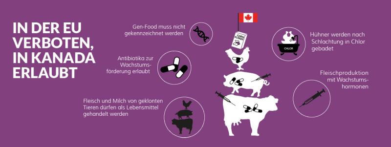 Zwar sind sich zahlreiche Europäer:innen des Risikos bewusst, dass durch TTIP die Lebensmittelstandards auf die der USA herabgezogen werden, doch gibt auch CETA in seiner gegenwärtigen Fassung Anlass zu Besorgnis. Denn die in Kanada geltenden Gesetze zur Lebensmittelsicherheit unterscheiden sich in vielen Punkten gravierend von denen in Europa – insbesondere in so sensiblen Bereichen wie Gentechnik, Lebensmittelkennzeichnung oder der in Kanada nur zwiespältigen Anwendung des Vorsorgeprinzips, wie im Bereich der Pestizide. Auf bundesstaatlicher Ebene sieht die kanadische Regierung zudem keinerlei Strafen für die Nichteinhaltung der - ohnehin nur freiwilligen - Tierschutzcodices vor.