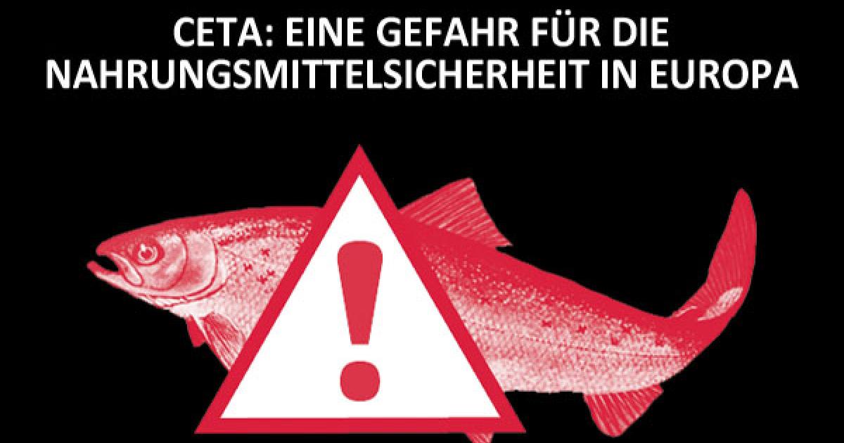roter Fisch mit Rufzeichen auf schwarzem Hintergrund "CETA: eine Gefahr für die Nahrungsmittelsicherheit in Europa"