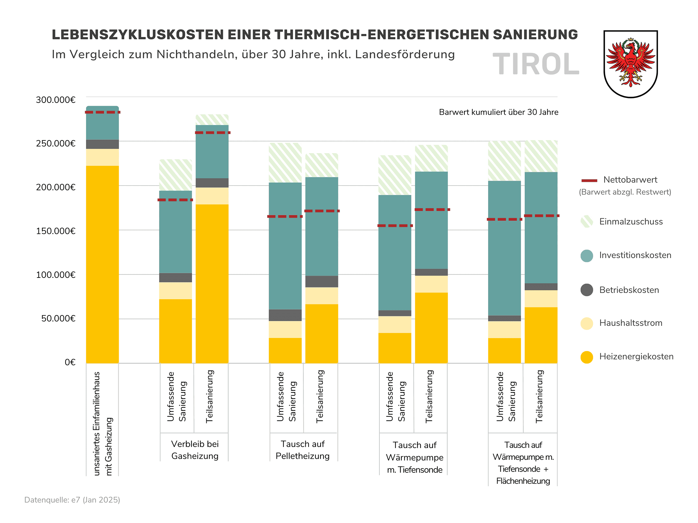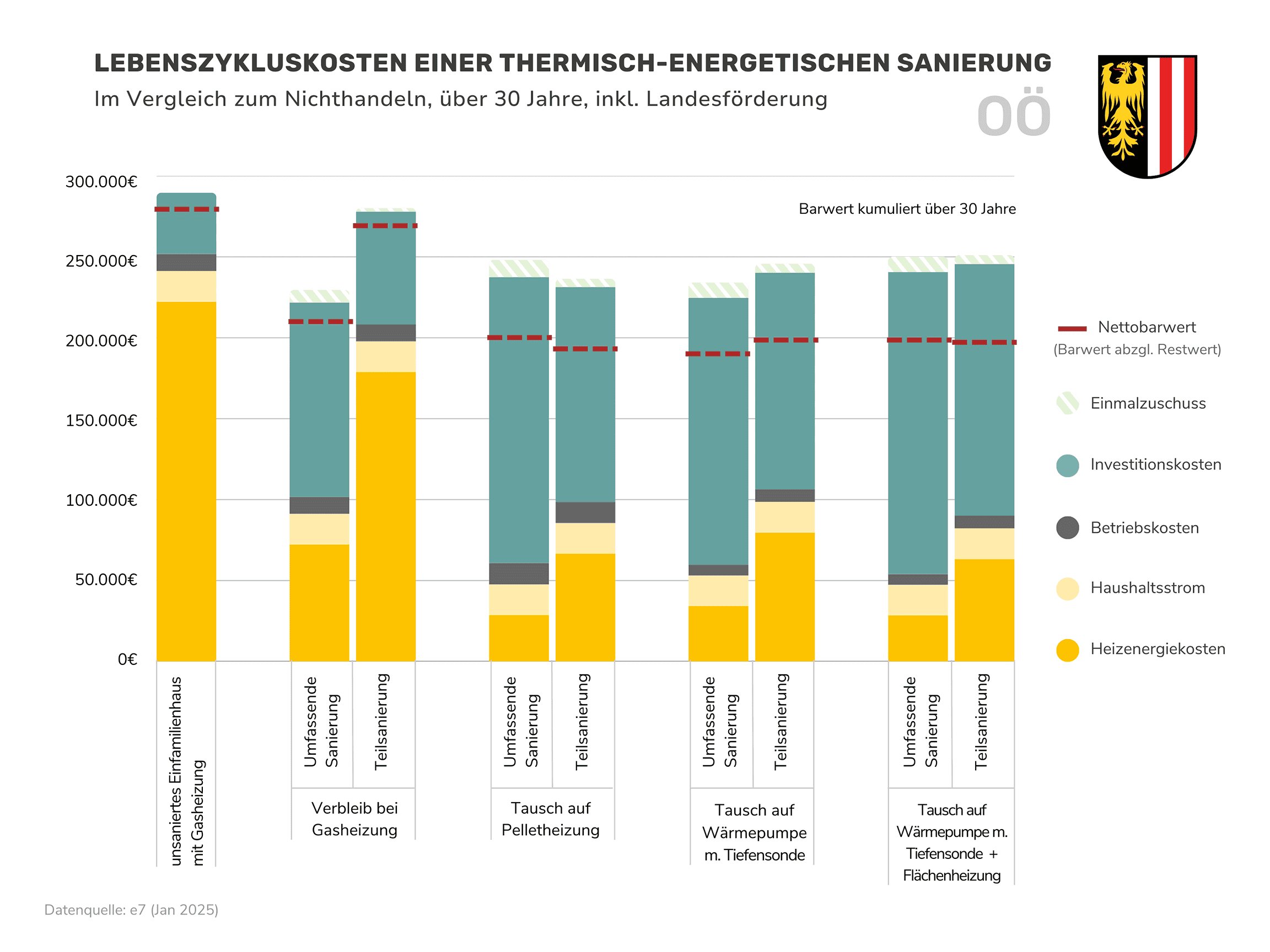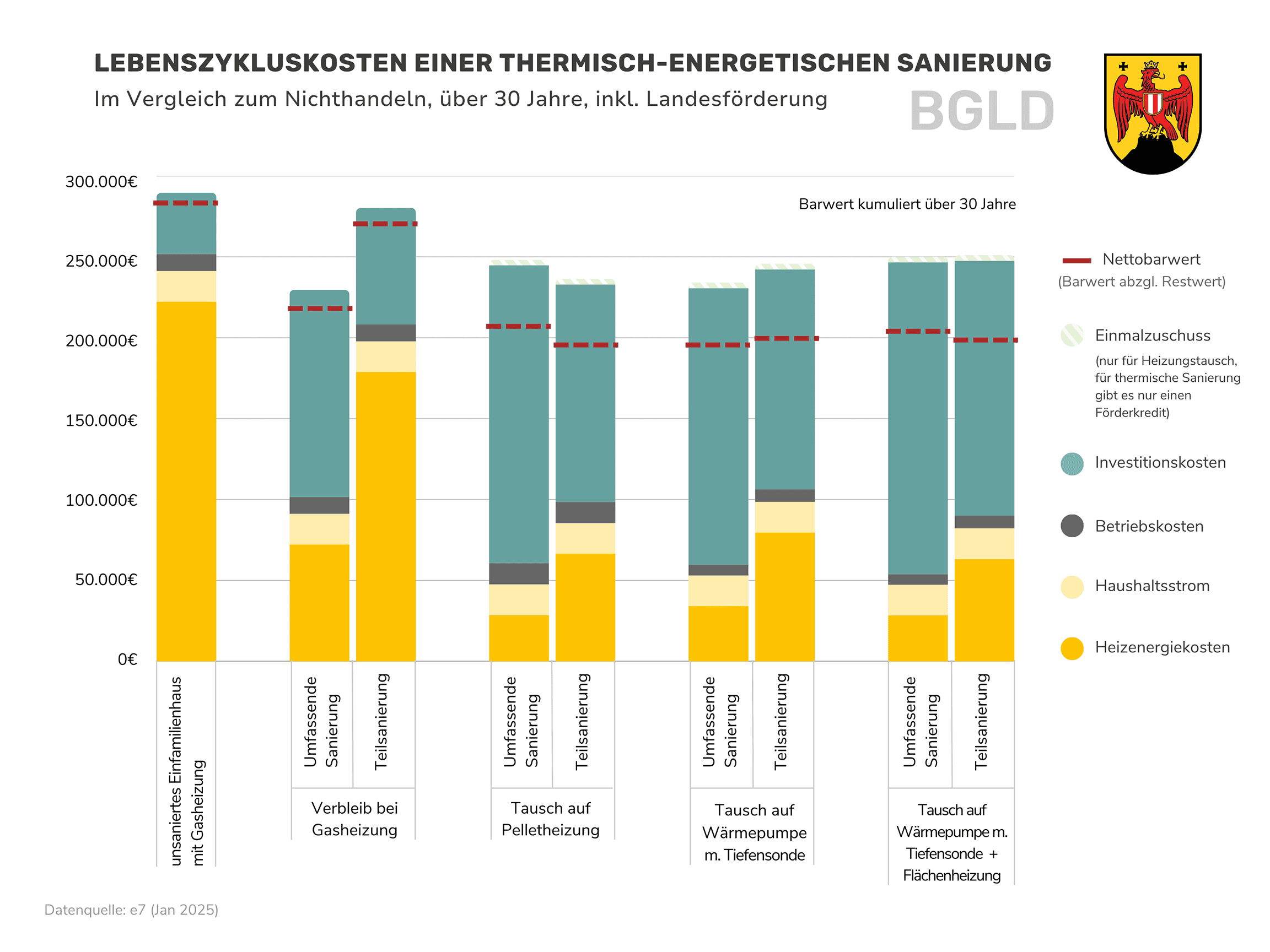 Die Restwerte nach 30 Jahren Nutzungsdauer sind in diesen Zahlen mitberücksichtigt. Die Unterschiede zwischen den Bundesländern ergeben sich aufgrund des unterschiedlichen Förderangebots. Im Burgenland, Niederösterreich und in Vorarlberg schneidet die Variante mit einer Pelletheizung und Teilsanierung gleich gut ab. Generell liegen die verschiedenen Varianten meist nahe beieinander (siehe Ergebnis-Grafiken der Bundesländer weiter unten).