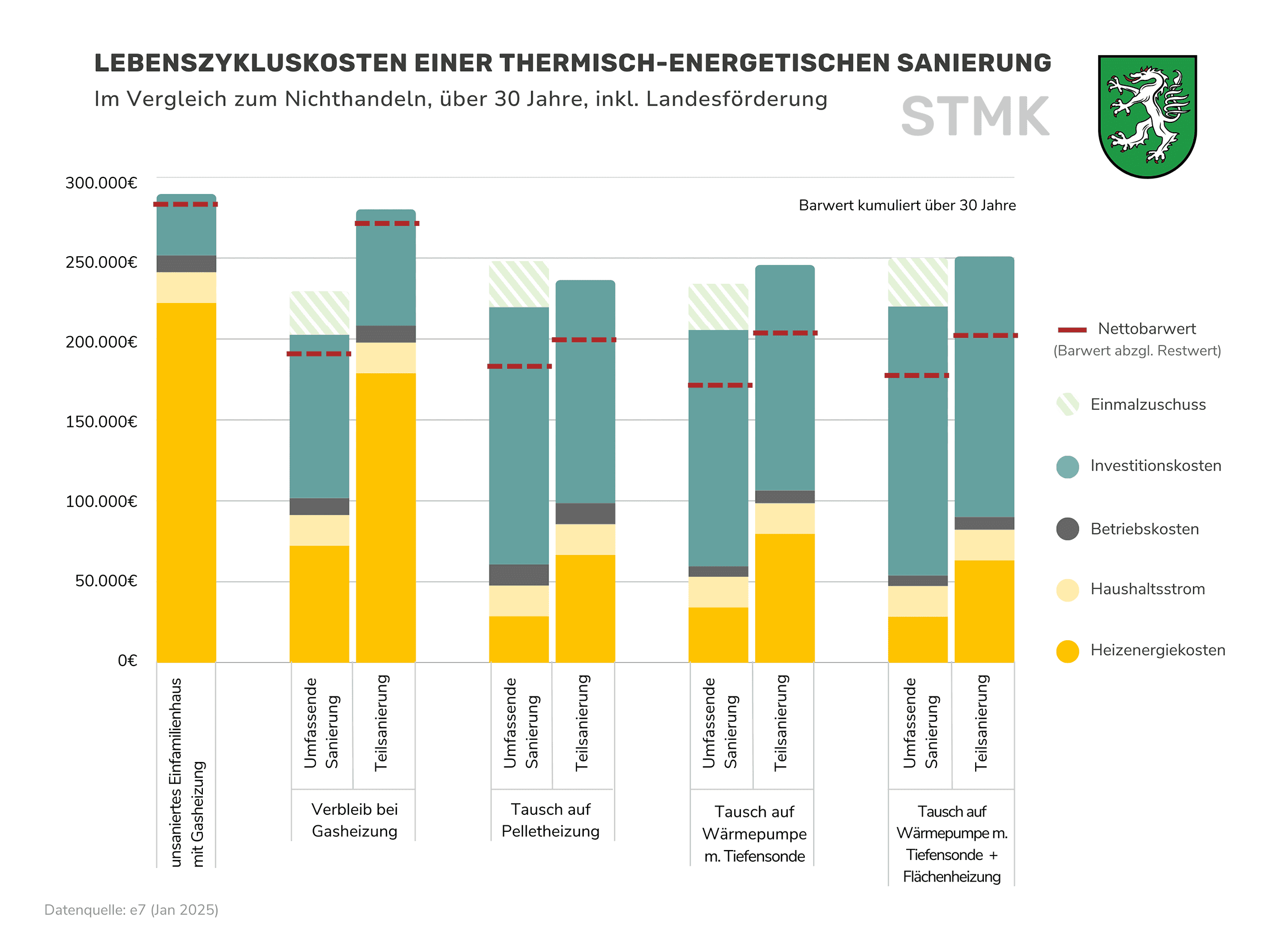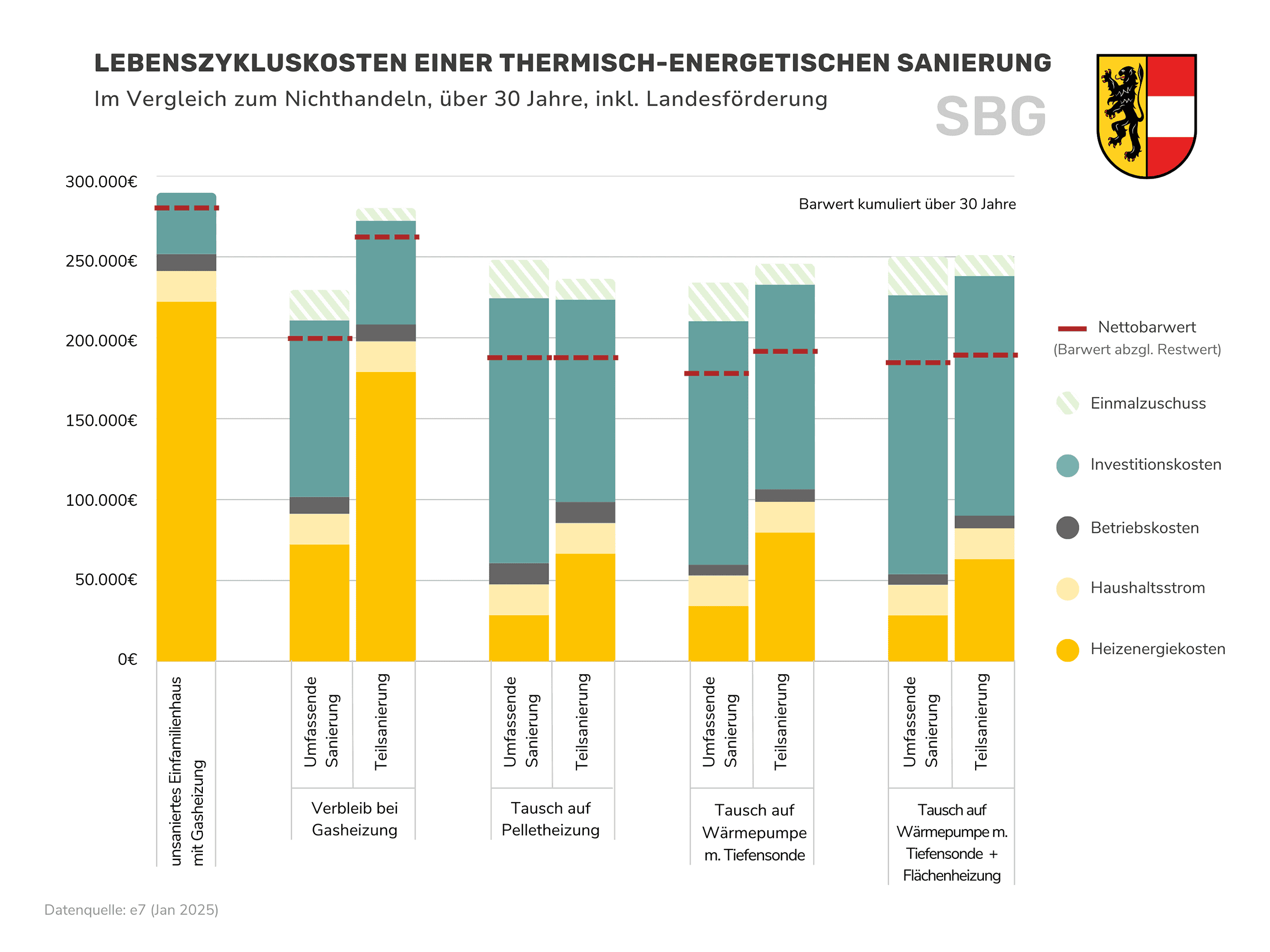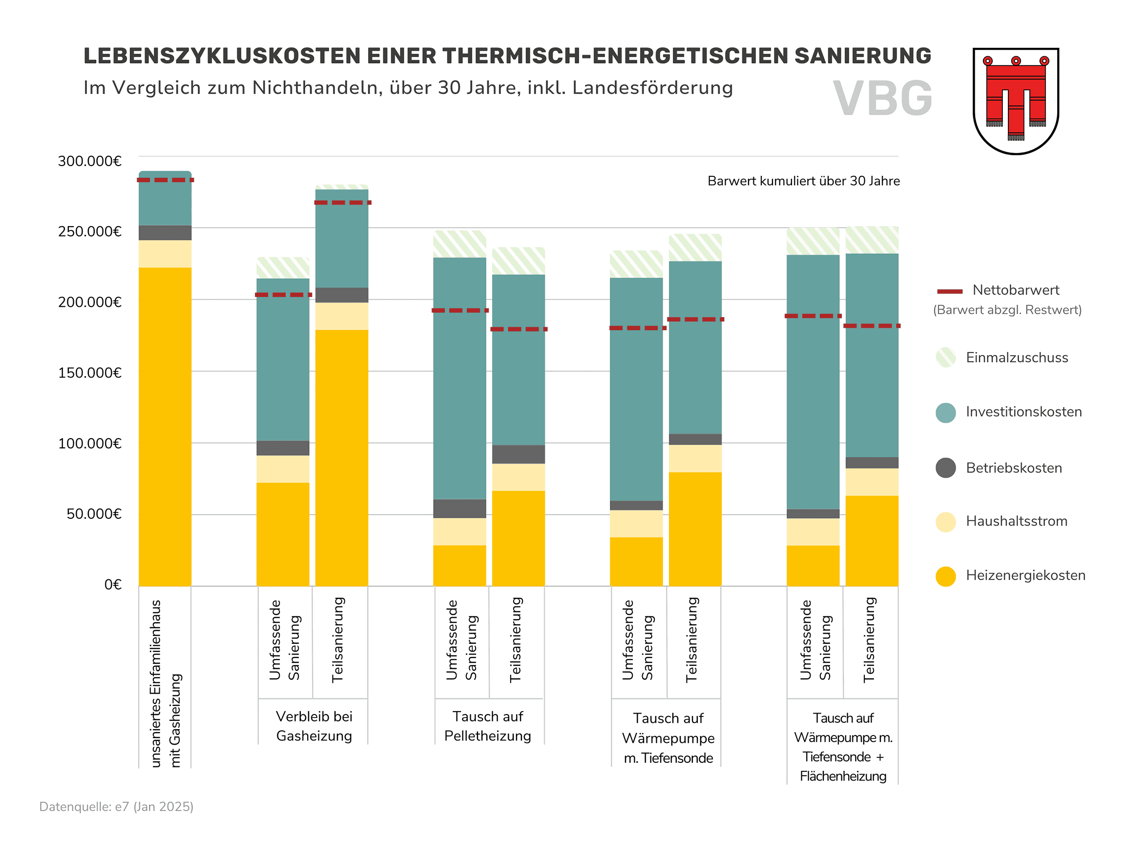 Die Restwerte nach 30 Jahren Nutzungsdauer sind in diesen Zahlen mitberücksichtigt. Die Unterschiede zwischen den Bundesländern ergeben sich aufgrund des unterschiedlichen Förderangebots. Im Burgenland, Niederösterreich und in Vorarlberg schneidet die Variante mit einer Pelletheizung und Teilsanierung gleich gut ab. Generell liegen die verschiedenen Varianten meist nahe beieinander (siehe Ergebnis-Grafiken der Bundesländer weiter unten).