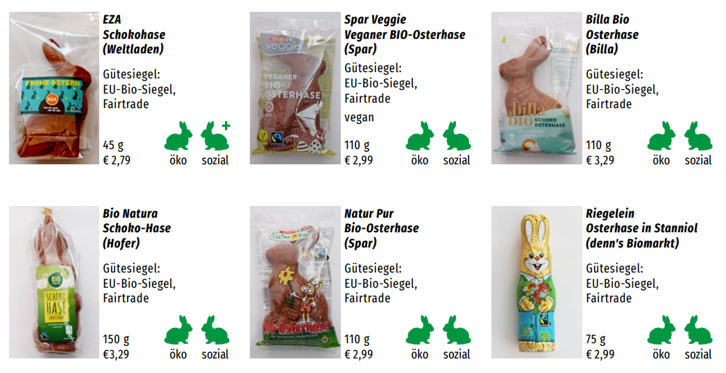 36 Schoko-Osterhasen wurden von Südwind und GLOBAL 2000 für den Osterhasen-Check auf ihre sozialen und ökologischen Siegel bewertet. Der Check bezieht sich auf jene Schokoladen-Figuren, die bis 14.03.2022 im österreichischen Handel erhältlich waren.